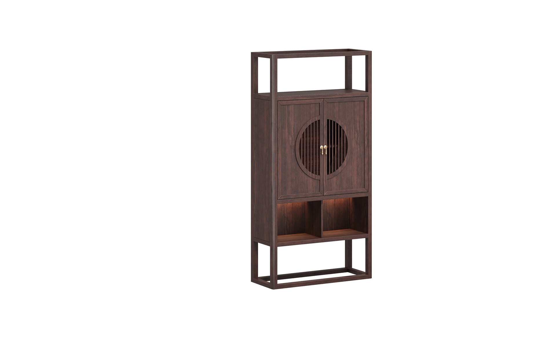 挡板圆型设计,金铜件装饰,铜木结合,镂空竖条元素的原木栅格设计,凸显中式与现代的融合韵味。