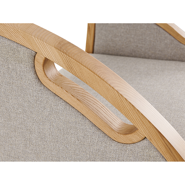 【材质说明】: 扶手外框采用A级白蜡木制作,木扶手经开料、造型、打磨、喷漆制作;座背软包可选配布纹及皮革软包。