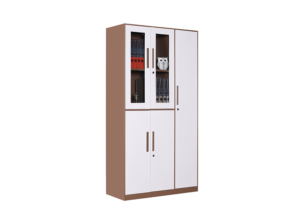 ● 一体结构设置,上部玻璃对开门,内置1层层板可调高度,内置物品可视,便于拿取,中间2个抽屉,下部对开铁门、门内一格板,设置有拉手和锁。