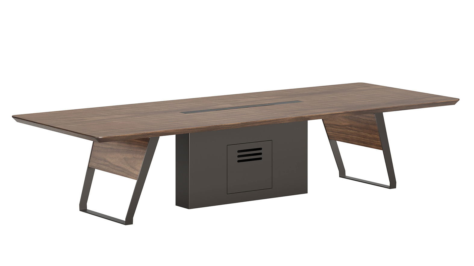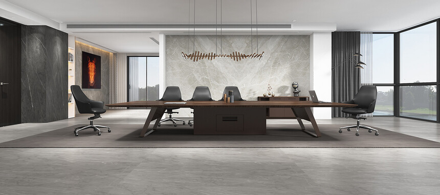 极致办公系列,秉承华旦的时尚优雅的品牌基因,以直线中穿插多维弧度的造型语意,将天然的半开放胡桃木纹与金属的质感有机组合,尽显原木风情与利落高效。