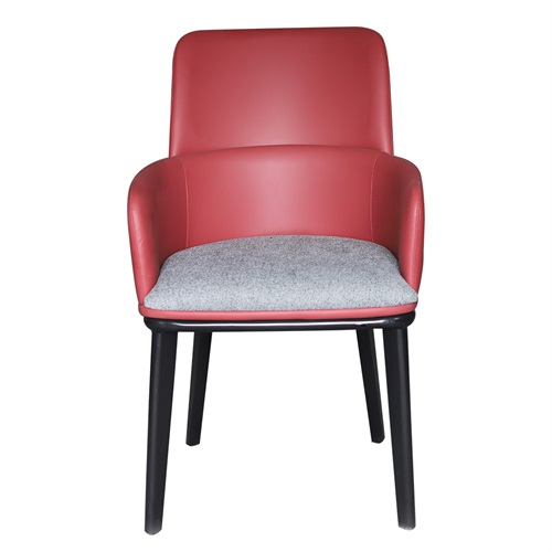 图片展示\价格说明\定做服务。这款咖啡店餐椅整体设计现代简约,红色的皮革靠背与扶手展现出优雅且热情的气质,搭配灰色布艺坐垫,为用户提供舒适的体验。椅腿采用优质实木材质,纹理自然且结构稳固,既兼顾了耐用性,又为整体设计增添了一份温润质感。整体外观时尚大方,非常适合咖啡店、餐厅等商业空间,既实用又提升了环境的品位。