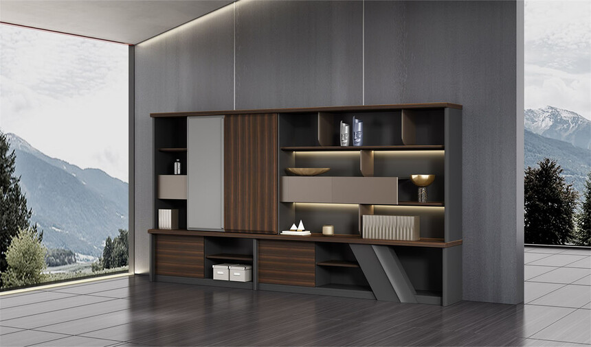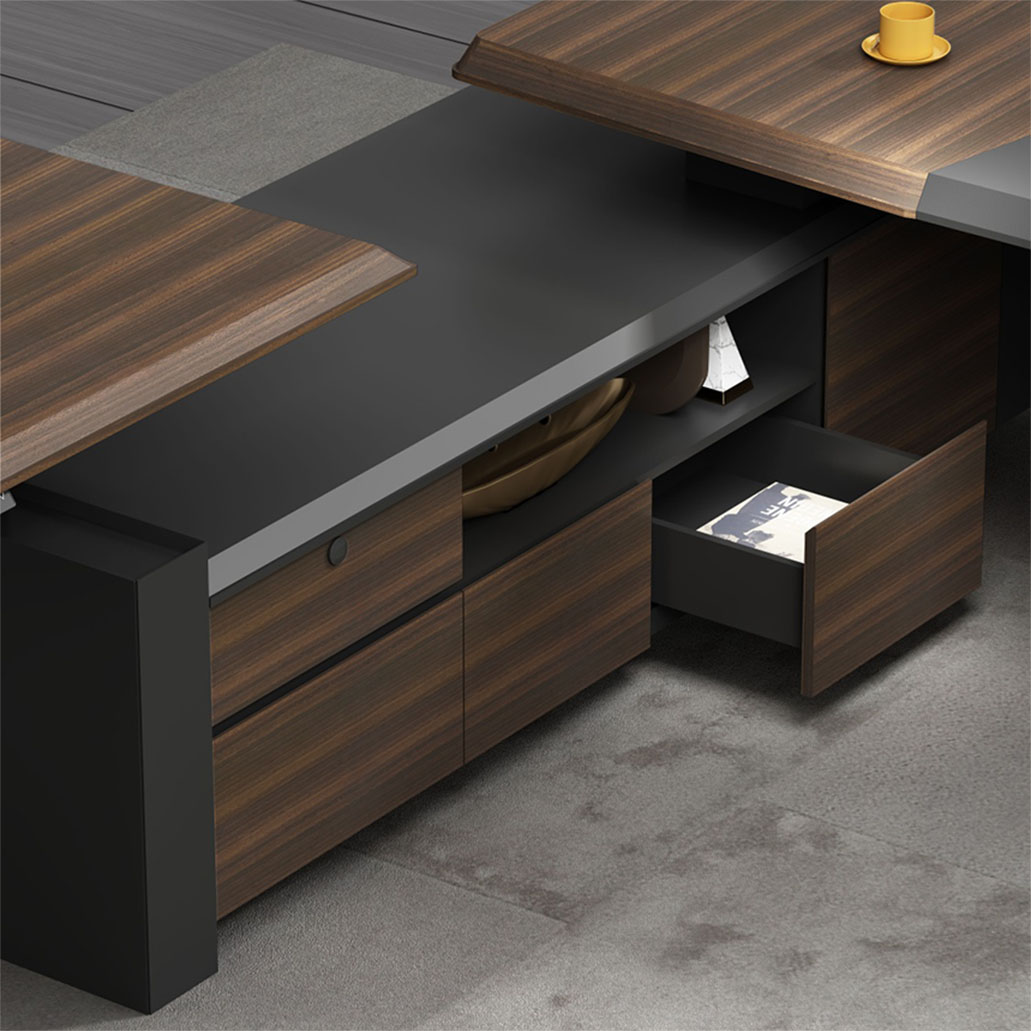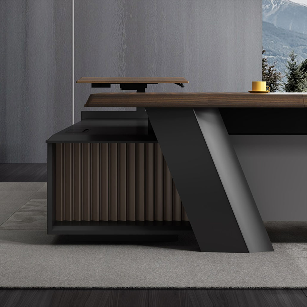 浩韵系列 深邃神秘,时尚富有魅力。态势沉稳又不失灵动,富有个性而不张扬。设计灵感源于建筑的倾斜式支撑给人带来的冲击感。不同材质的相互碰撞,实木结合金属嵌件,充满现代气息。在现有的办公功能上结合隐藏的电动升降台,将科技与美学完美结合,打造时尚简洁的现代化办公空间。