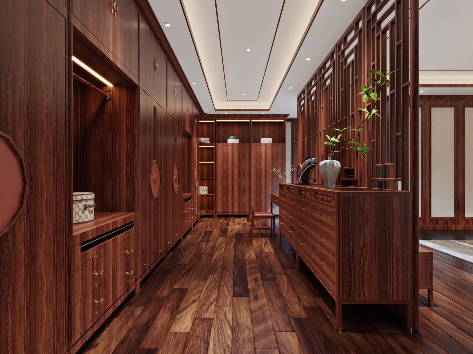 此外,庭院与书房是中式别墅的独特空间,传统的圈椅、博古架、花几等家具与绿植、假山相得益彰,形成一幅优美的生活画卷。整体而言,新中式家具不仅传承了传统文化,还完美契合了现代人的生活需求,使中式别墅焕发出独特的艺术魅力与生活品质。