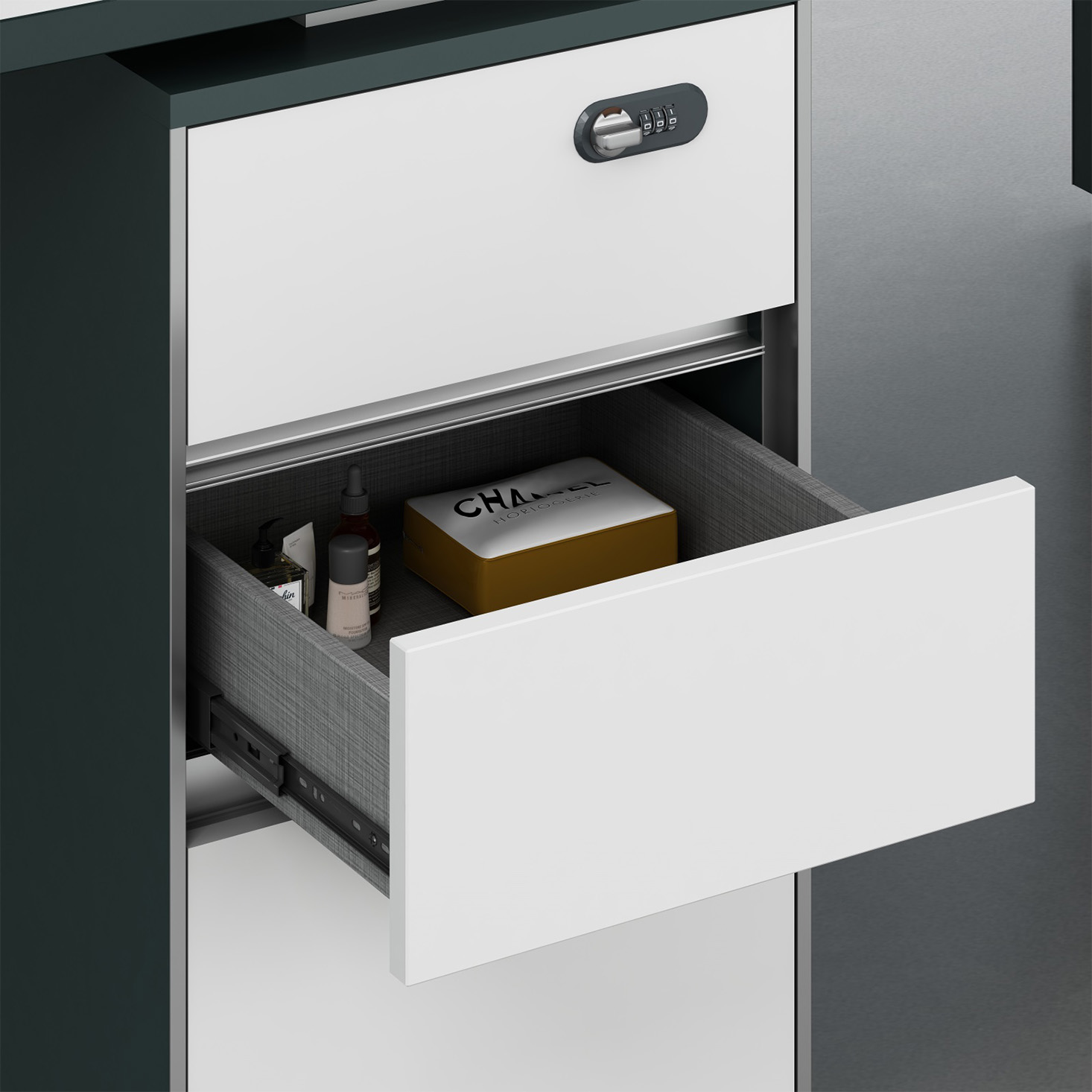 - A:澳洲尤加利+进口暖白 B:进口暖白+暗夜绿 不含桌屏(抽屉带密码锁)